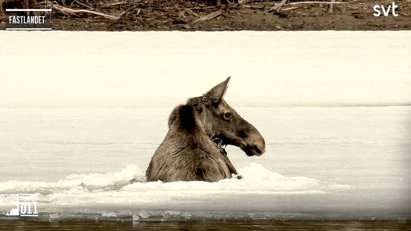 En älgko med sin kalv går genom isen när de försöker ta sig över ångermanälven mot sommarbetet.